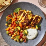 DruckenHalloumi auf Kichererbsengemüse mit Oliven-Tomatensalat und Minzjoghurt
